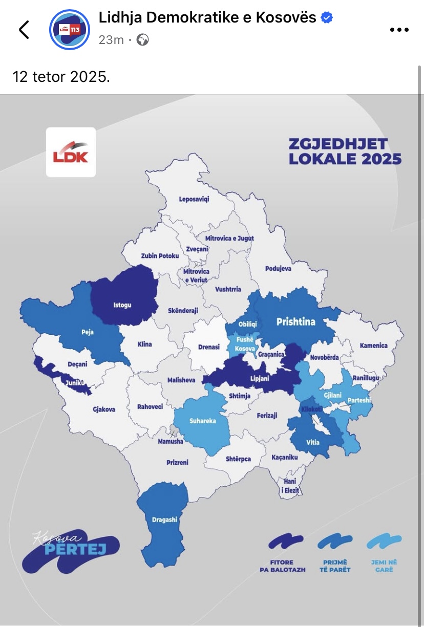 Ndonëse sipas faqes së KQZ-së, figurojnë vetëm Lipjani e Istogu si komuna të fituara pa balotazh, LDK thotë se ka fituar edhe Junikun.