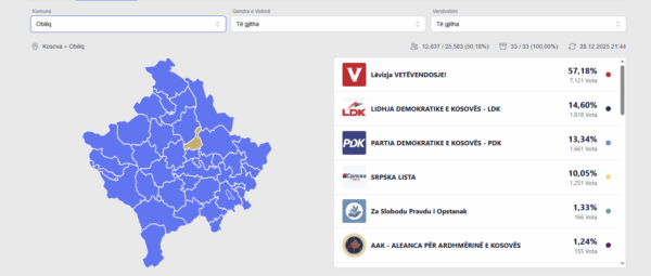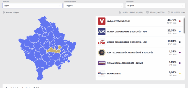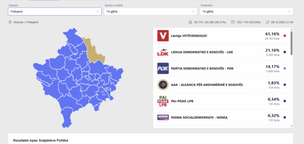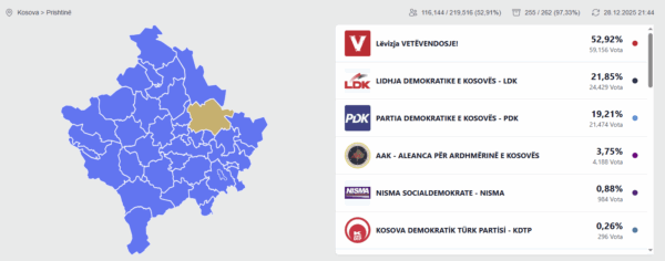 Kur po numërohen 93% të kutive të votimit, sipas KQZ-së, LDK ka 13,85 %.
