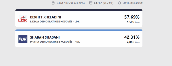 Kandidati i LDK-së, Bexhet Xheladini po prin bindshëm me 3 mijë e 948, ndërsa kandidati i PDK-së, Shaban Shabani ka marrë 2 mijë e 876vota.
