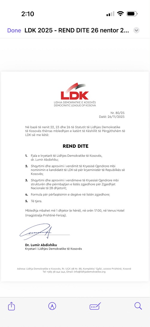 LDK sot pritet të aprovojë kandidatin për kryeministër, ky është rendi i ditës (DOKUMENT)