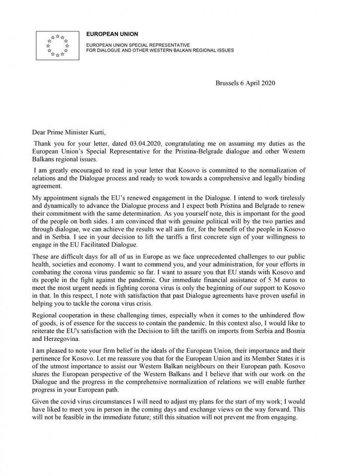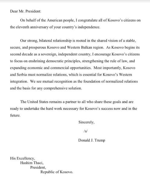 Në këtë letër, presidenti amerikan shkruan se SHBA-ja synon që të arrijë një marrëveshje që do të sigurojë njohjen ndërmjet Kosovës dhe Serbisë. Ai dëshiron të thyejë Status Quon në Ballkanin Perëndimor, duke ofruar një perspektivë të dy shteteve, të cilat tash e sa dekada janë në konflikt. Por, kryeministri në dorëheqje, Albin Kurti, edhe zyrtarisht e ka zëvendësuar presidentin e SHBA-së, Donald Trump, me Josep Borrellin dhe ambasadorin Richard Grenell me Miroslav Lajçakun. Amerikën e ka ndërruar me Spanjën dhe Sllovakinë. Me këtë veprim, Kurti ia hoqi Kosovës ‘Republikën’ dhe Prishtinën e zëvendësoi me ‘Pristina’, derisa dialogun Kosovë – Serbi e zëvendësoi me Beograd-Pristina. D