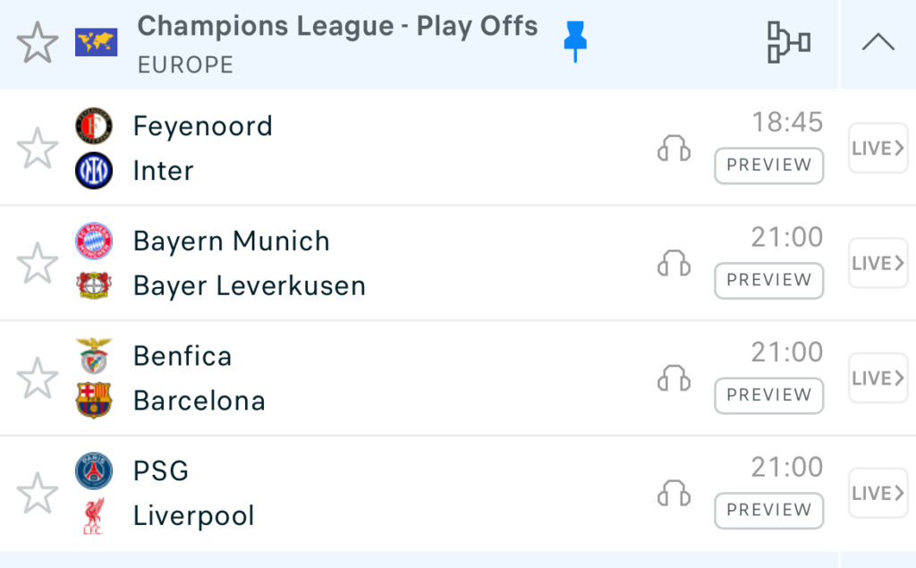 Liga e Kampionëve vazhdon sot me ndeshjet e radhës të 1/8-tës.Me fillin nga ora 18:45, Feynoord dhe Inter përballen në Rotterdam, me skuadrën holandeze që eliminoi rivalin e Neruazzurëve, Milanin.