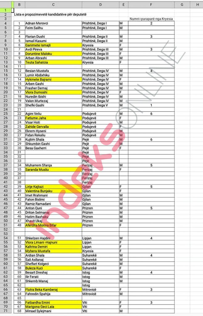 Lista e 71 të propozuarve për kandidatë për deputetë nga LDK-ja