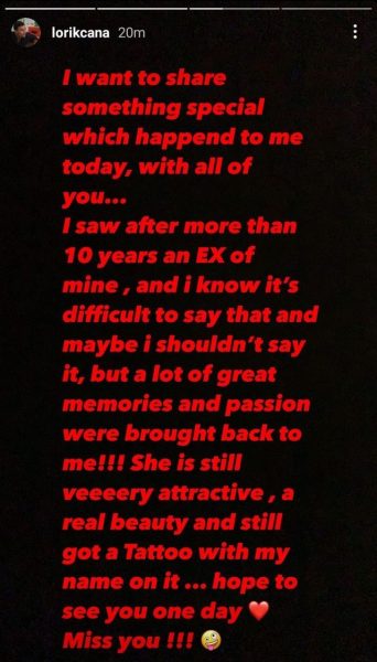 “Dua të ndaj diçka speciale me ju sot. Pashë ish-in tim pas më shumë se 10 vitesh. E di sa e vështirë është ta them, mbase edhe e gabuar, por shumë kujtime dhe pasion më kthyen pas në kohë. Ajo është akoma shumë tërheqëse dhe një bukuroshe e vërtetë. Madje ka akoma një tatuazh me emrin tim. Shpresoj të të shoh një ditë. Më mungon”, shkroi Loriku në postimin e tij.