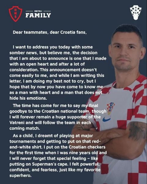 “Nuk ishte një vendim i lehtë, por sot i them lamtumirë Kroacisë. Kam ëndërruar gjithmonë ta vishja këtë fanellë dhe nuk do ta harroj kurrë debutimin tim në Kombëtare në vitin 2009. Në pesë vjetët e fundit i kemi shkruar kapitujt më të bukur në historinë e Kroacisë. I falënderoj të gjithë trajnerët, shokët e skuadrës dhe tifozët”, ka shkruar ish-futbollisti i Liverpoolit.