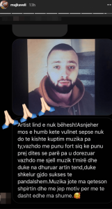 “Artist lind e nuk bëhesh! Asnjeher mos e humb kete vullnet sepse nuk do te kishte kuptim muzika pa ty, vazhdo me punu fort siq ke punu prej dites se parë pa u dorezuar vazhdo me sjell muzik t’mirë dhe duke na dhuruar artin tend, duke shkelue gjdo sukses te pandalshem. Muzika jote ma qeteson shpirtin dhe me jep motiv per me te dasht edhe ma shume”, kishte shkruar ajo.