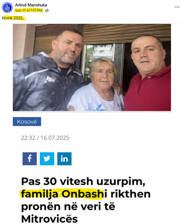 Manxhuka ka publikuar në Facebook të njëjtën temë më 17 korrik dhe sot më 25 korrik, të njëjtn lajm me dy persona të ndryshëm – por, vëllezër – për kthimin e një prone.