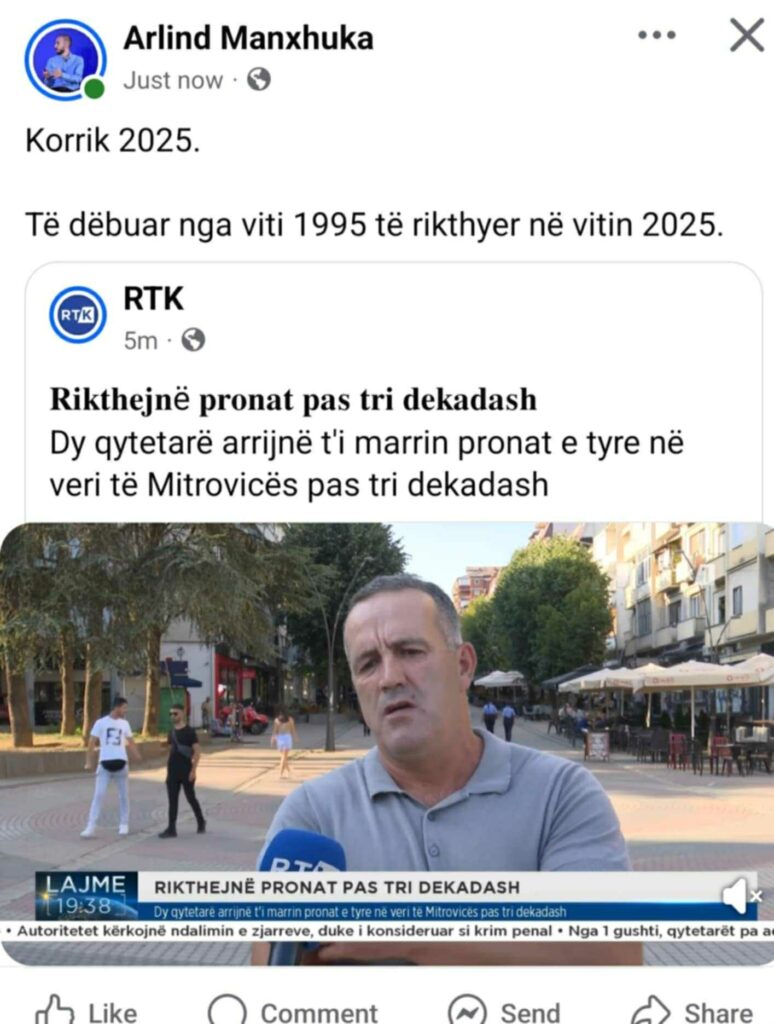 Zëdhënësi i Vetëvendosjes, Arlind Manxhuka së bashku me Radio Televizionin e Kosovës (RTK), kanë propaganduar dukee ‘shitur’ dy herë të njëjtën lajm, për kthimin e një familje pas 30 vitesh në pronën e tyre në pjesën veriore të Mitrovicës që ishte uzurpuar prej vitit 1995.