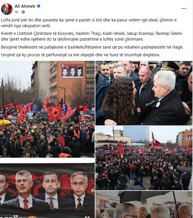 “Lufta jonë për liri dhe pavarësi ka qenë e pastër si loti dhe ka pasur vetëm një ideal, çlirimin e vendit nga okupatori serb.Krerët e Ushtrisë Çlirimtare të Kosovës, Hashim Thaçi, Kadri Veseli, Jakup Krasniqi, Rexhep Selimi dhe tjerët edhe njëherë do ta dëshmojnë pastërtinë e luftës sonë çlirimtare”, ka shkruar ai, raporton Periskopi.