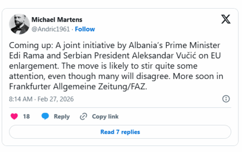 “Një iniciativë e përbashkët nga kryeministri i Shqipërisë Edi Rama dhe presidenti serb Aleksandar Vuçiq mbi zgjerimin e BE-së. Ky veprim ka të ngjarë të tërheqë mjaft vëmendje, edhe pse shumë nuk do të jenë dakord”, ka shkruar ai në X.