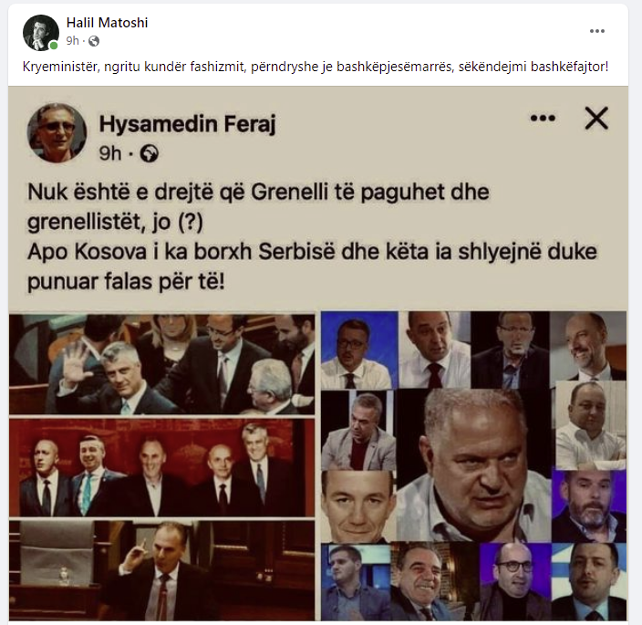 “Kryeministër, ngritu kundër fashizmit, përndryshe je bashkëpjesëmarrës, e sëkëndejmi bashkëfajtor,” – ka shkruar z. Matoshi, përcjell Periskopi.