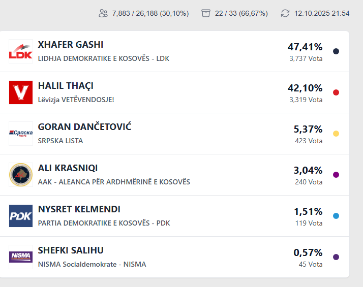 Në vendin e parë deri më tani nga 20 kuti të numëruara është Xhafer Gashi i LDK-së me 47.21 për qind apo 3 mijë e 321 vota.