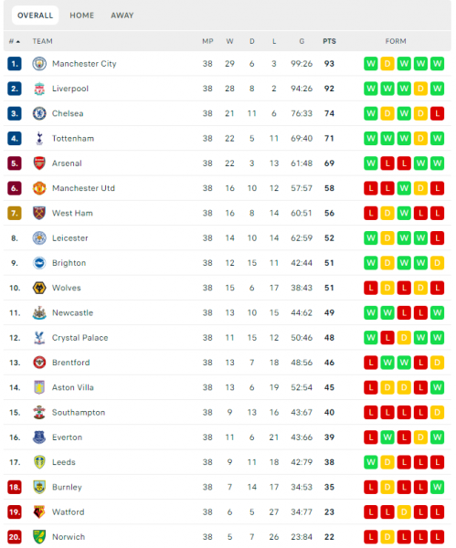 Ka përfunduar në tërësi sezoni 2021/22 në Premierligë. Manchester City është shpallur kampion edhe për këtë edicion.