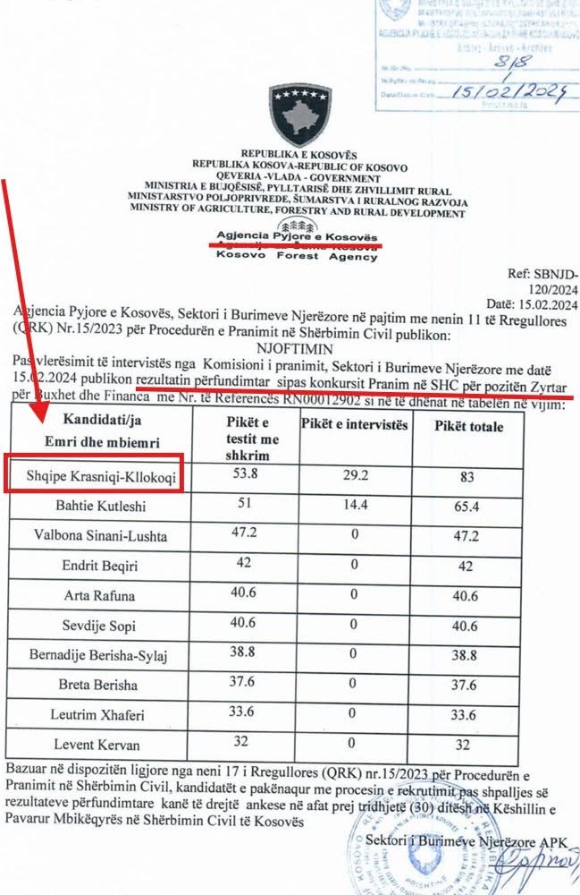 Dhe sipas tij, gruaja e hetuesit, Shqipe Krasniqi-Kllokoqi punësohet në Ministrinë e Bujqësisë, në Agjencinë Pyjore të Kosovës si Zyrtare për Buxhet dhe Financa.