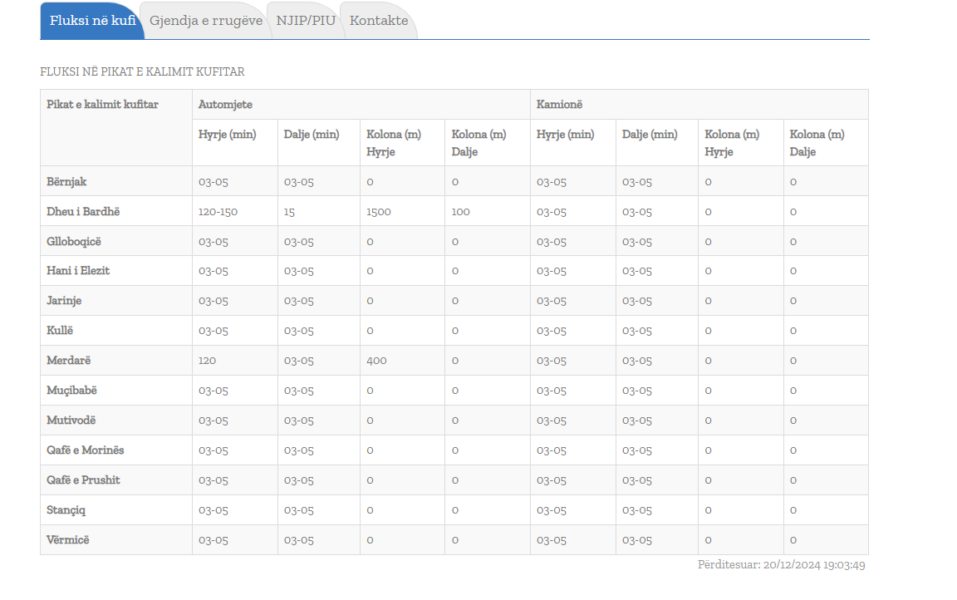 Në njoftim tregohet se pritjet më të gjata janë te Dheu i Bardhë dhe në Merdarë