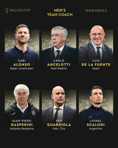 Të nominuarit për trajnerin e vitit janë, Xabi Alonso, Carlo Ancelotti, Luis De La Fuente, Gian Piero Gasperini, Pep Guardiola dhe Lionel Scaloni, shkruan “Gazeta Express”.