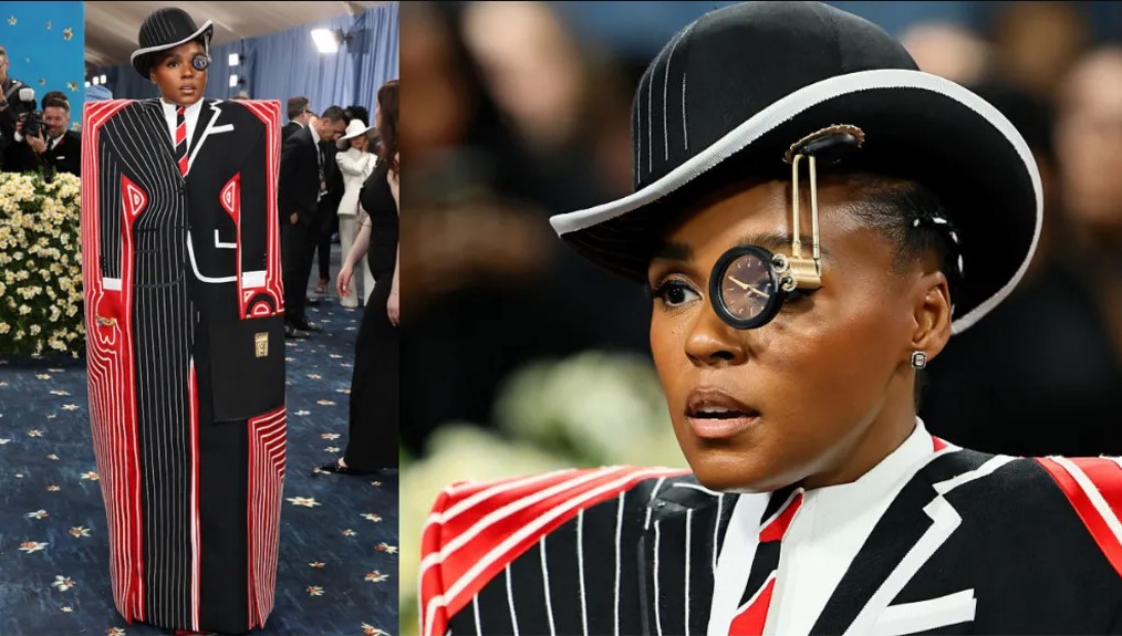 Janelle Monáe deklaroi lirinë përmes një kostumi të personalizuar nga Thom Browne, duke u shfaqur plot vetëbesim.