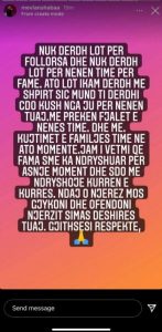 “Nuk derdh lot per folloërsa dhe nuk derdh lot per nenen time per fame. Ato lot i kam derdh me shpirt sic mund ti derdhi cdo kush nga ju per nenen tuaj. Me preken fjalet e nenes time dhe me kujtimet e familjes time ne ato momente. Jam i vdemi qe fama sme ka ndryshuar per asnje moment dhe sdo me ndryshoje kurren e kurres. Ndaj o njerez mos gjykoni dhe ofendoni njerzit simas deshires tuaj. Gjithsesi, respekte”, shkruan ai.