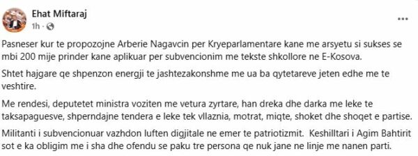 Miftaraj ironizon me VV: Kur të propozohet Nagavci kanë me arsyetu si sukses se mbi 200 mijë prindër kanë aplikuar për libra