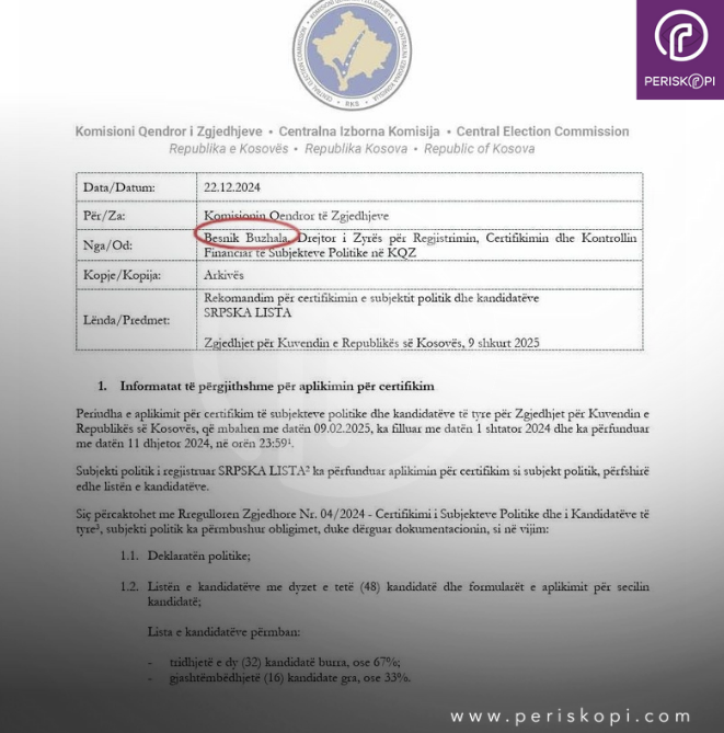 Ky rekomandim që konstatonte se pas verifikimit “gjithçka është në rregull me Listën Serbe”, është përgatitur nga drejtori i Zyrës për Regjistrim dhe Certifikim të Partive Politike, Besnik Buzhala.