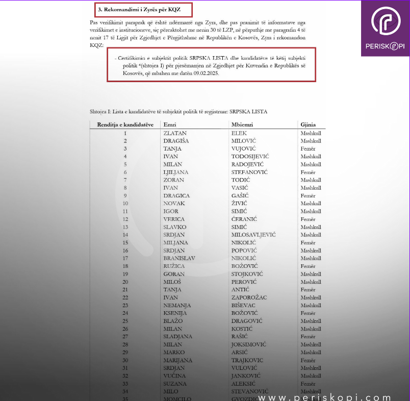 E gjitha kjo, pasi Periskopi ka arritur të sigurojë rekomandimin e përgatitur për certifikimin e Listës Serbe dhe 48 kandidatëve të saj për deputet.