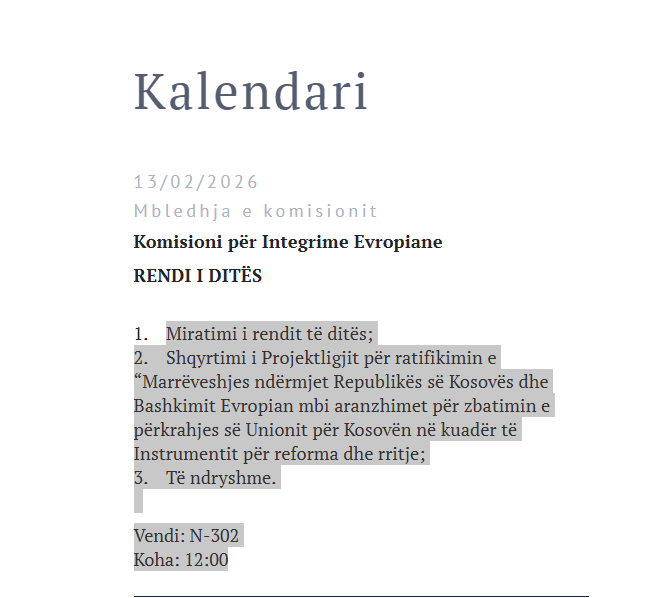 Ky Komision siç njofton Kuvendit “do të shqyrtojë Projektligjin për ratifikimin e “Marrëveshjes ndërmjet Republikës së Kosovës dhe Bashkimit Evropian mbi aranzhimet për zbatimin e përkrahjes së Unionit për Kosovën në kuadër të Instrumentit për reforma dhe rritje”.