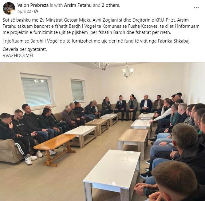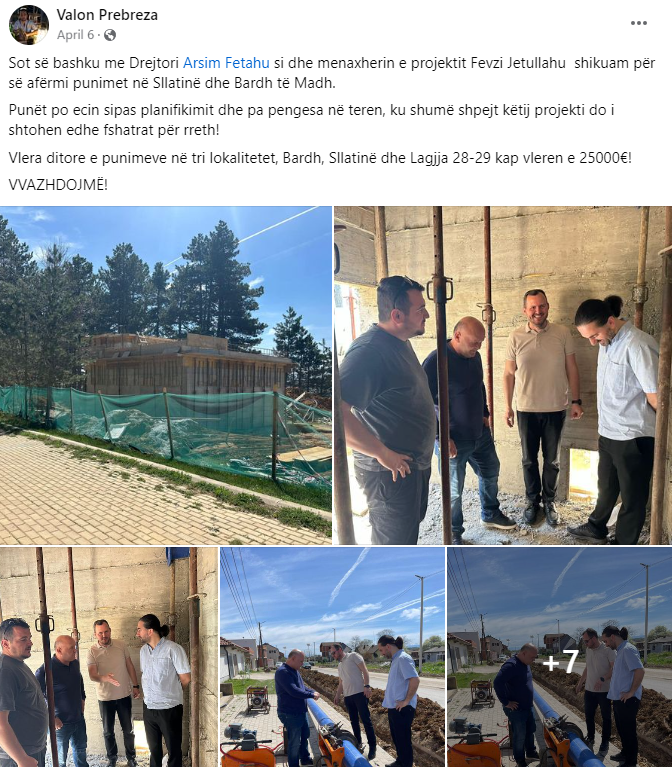 Madje përmes disa postimeve në llogarinë e tij në Facebook, Valon Prebreza bashkë me Arsim Fetahun kanë vizituar nga afër disa fshtara të Fushë Kosovës nga ku edhe premtuan furnizmin me ujë të pijshëm.