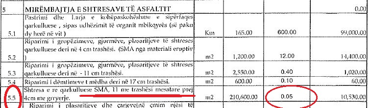 Mëshohet se aty janë gërryer 220 mijë m2 asfalt, që aktualisht në treg kushton rreth 7 euro m2 i asfaltit me fibra, e që kompanisë do t’i kushtonte rreth 1.3 milionë euro, po ta asfaltonte. Por, kompania, sipas kontratës e cila është e publikuar në KRPP, tek lista e çmimeve të kontratës, kapitulli 5 që ka të bëjë me “Mirëmbajtja e shtresave të asfaltit”, pika 5.5 ka paraparë pozicionin “Shtesa e re qarkulluese SMA, 11 me trashësi mesatare prej 4 cm me gërryerje”. Në këtë kontratë, për tri vite, për këtë pozicion kanë qenë të parapara të asfaltohen sasia prej 210, 600. 00 m2, në një vlerë prej 0,5 cent për m2. Totali i saj i bie vetëm 10 mijë e 530 euro.