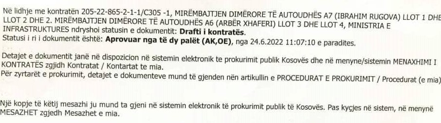 “Në lidhje me kontratën “Mirëmbajtja dimërore e autoudhës A7 (Ibrahim Rugova) llot 1 dhe llot 2 dhe Mirëmbajtja dimërore e autoudhës A6 (Arbër Xhaferi) llot 3 dhe llot 4”, Ministria e Infrastrukturës ndryshoi statusin e dokumentit: Drafti i kontratës.