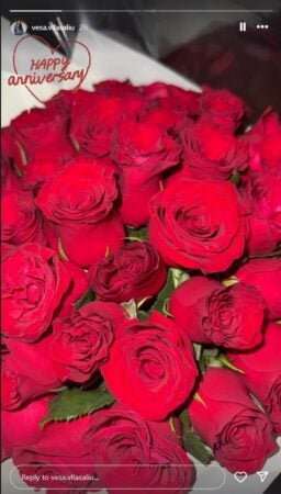 Në fotot e publikuara, çifti shfaqet duke shkëmbyer puthje, ndërsa në një tjetër postim Vesa ka treguar një buqetë me trëndafila të kuq, dhuratë nga Daku me rastin e përvjetorit të lidhjes së tyre. “Gëzuar përvjetorin”, ka shkruar ajo në mbishkrimin që shoqëronte foton romantike.