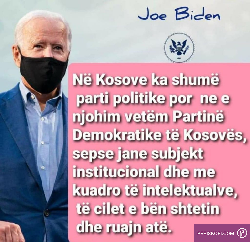 Nga kjo parti, militantë e votues të saj, po shpërndajnë një foto-montazhë gjoja sikur presidenti Biden e çmon më së shumti PDK-në nga partitë politike në Kosovë. E çmon për ‘institucionalitetin dhe intelektualët’ që ka në gji.