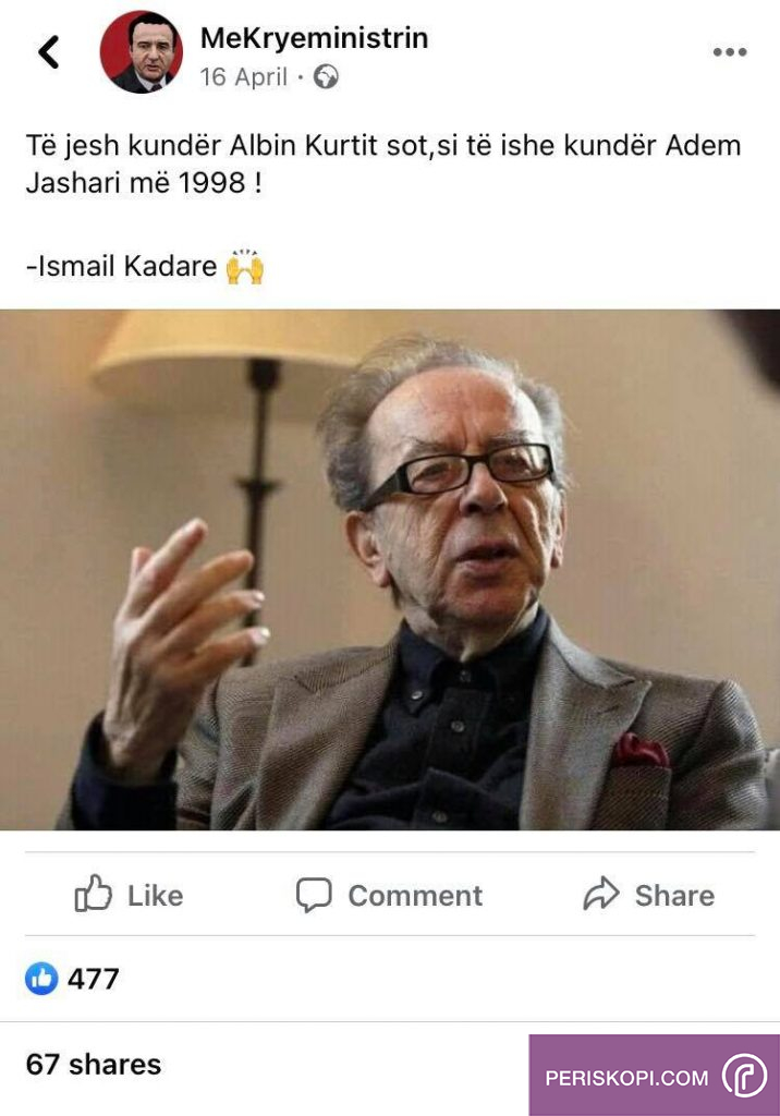 Për VV-në dhe liderin e saj Albin Kurti, z. Kadare në një univers paralel sipas militantëve të VV-së, na paska pas thënë se (mbani frymën…): ‘Të jesh kundër Albin Kurtit sot, është sikur të jesh kundër Adem Jasharit në vitin 1998’