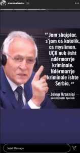 Këngëtarja dhe modelja e njohur shqiptare, Morena Taraku, shpërndau të mërkurën në InstaStory një fotografi, ku shfaqej fjalimi i Jakup Krasniqit, të thënë në Hagë gjatë këtyre ditëve.