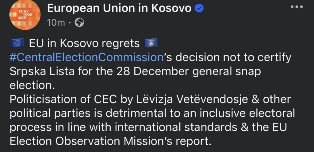Zyra e Bashkimit Evropian në Kosovë ka reaguar ashpër pas vendimit të Komisionit Qendror të Zgjedhjeve për të mos e certifikuar listën Srpska për zgjedhjet e 28 dhjetorit.