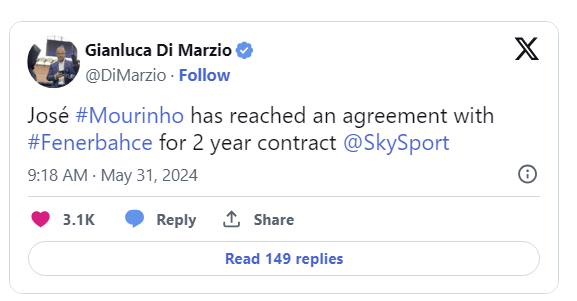 Është gazetari i njohur, Gianluca Di Marzio që raporton se Mourinho ka arritur marrëveshje dy vjeçare me Fenerbahcen.