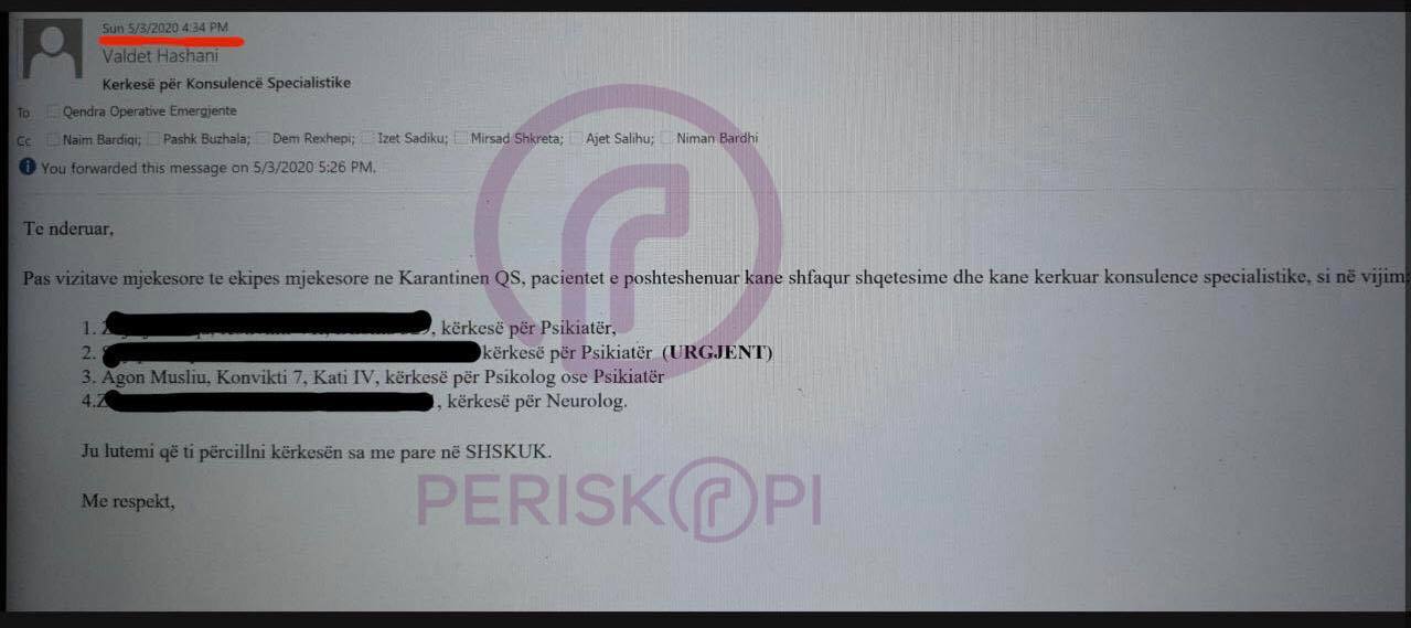 “Të nderuar, pas vizitave mjekësore të ekipit mjekësor në Karantinën QS, pacientët e poshtëshënuar kanë shfaqur shqetësime dhe kanë kërkuar konsulencë specialistike”, thuhet në e-mailin e dërguar nga Hashani.