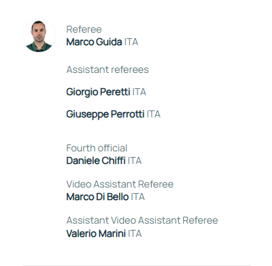 Marco Guida do të jetë gjyqtari kryesor i kësaj ndeshje, i asistuar nga Giorgio Peretti dhe Giuseppe Perrotti.