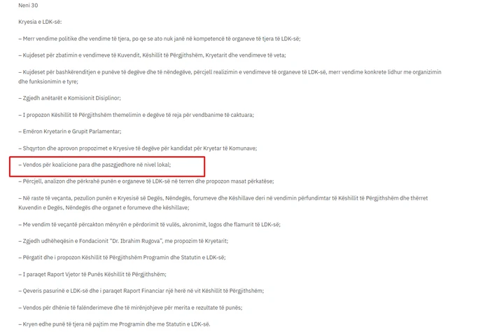 Po ashtu, statuti ndalon që anëtarët të mbajnë pozita brenda organeve të LDK-së nëse publikisht refuzojnë ose mohojnë vendimet e forumeve ku bëjnë pjesë.