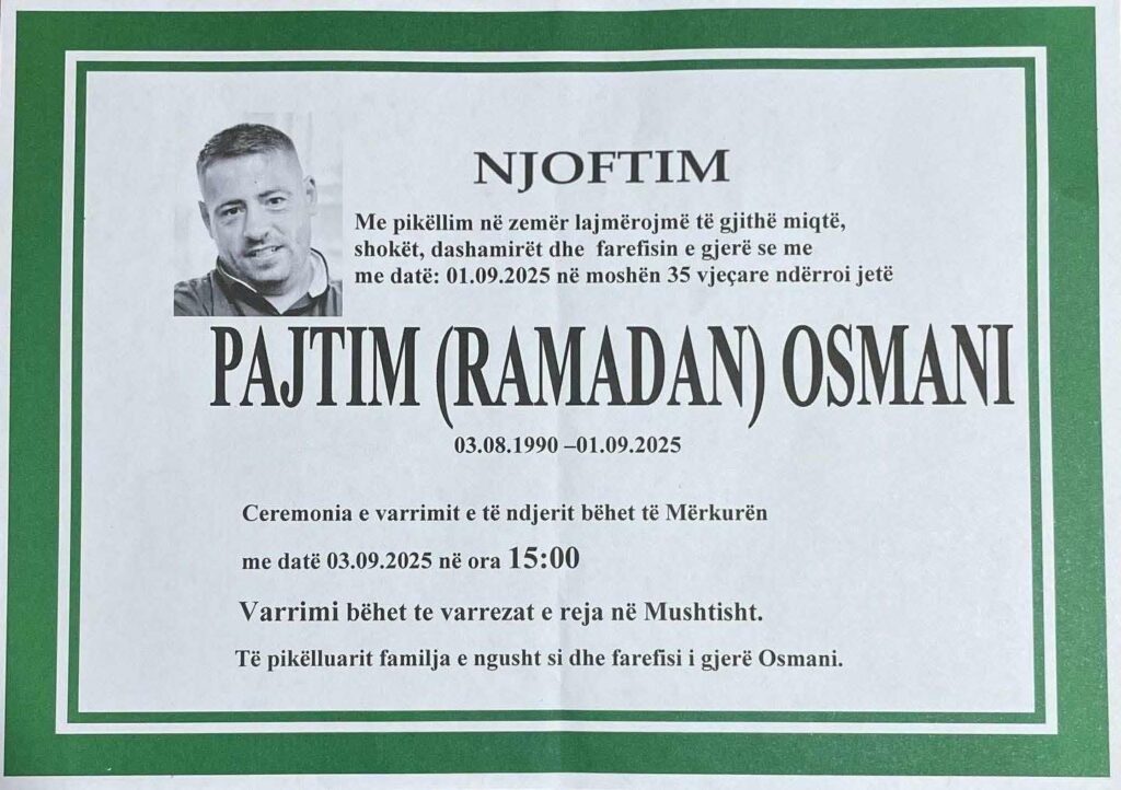 Sipas njoftimit mortor, i ndjeri do të varroset në varrezat e reja të fshatit Mushtisht.