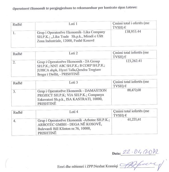 Tenderi ka qenë i ndarë në katër loto (pjesë), dhe lot 2 e ka fituar kompania “2A Group” në një vlerë prej 3.4 milionë euro me validitet për tri vite.Komisioni i ministrisë për vlerësimin e 18 ofertave, aq sa ka pranuar ky institucion, ka qenë në përbërje prej tre personave.