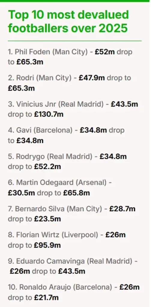 Pas tij vijnë Gavi i Barcelonës dhe Rodrygo Goes i Real Madridit, me të dy lojtarët që janë zhvlerësuar gjatë vitit 2025 për lotë 34.8 milionë funte.