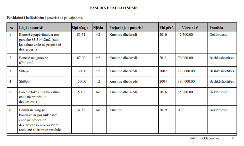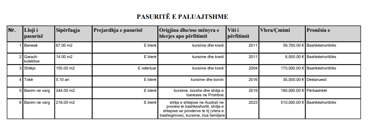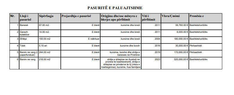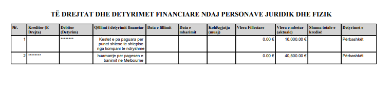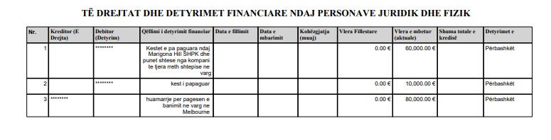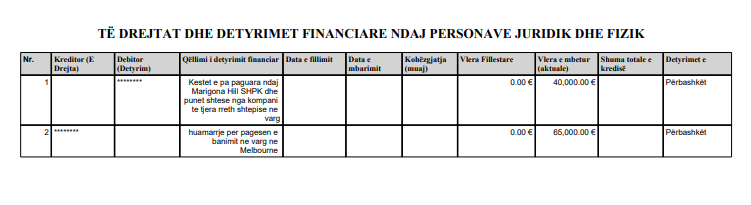 Ndërkohë, borxhi i mëhershëm prej 87 mijë euro ndaj “Marigona Hill” në vitin 2025 figuron vetëm 16 mijë euro, i përshkruar si “këste të papaguara për punë shtesë të shtëpisë nga kompani të ndryshme”.