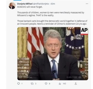Më tej këshilltarja Miftari në profilin e saj në Twitter ka paraqitur edhe fjalimin e ish presidentit amerikan, Bill Clinton i cili i ishte drejtuar qytetarëve amerikan për sulmet e NATO-s ndaj caqeve të Serbisë dhe arsyeve pse duhet të ndërhyjnë.
