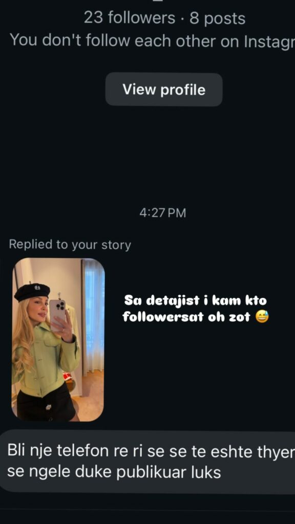 “Bli një telefon të ri se të është thyer, se ngele duke publikuar luks” ishte mesazhi që pranoi ajo.