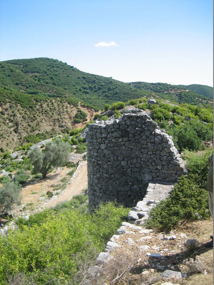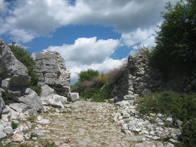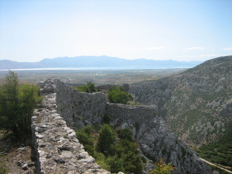 Muri i qytetit të Drivastos, në sfond liqeni i Skadarit me malet e Krajinës (Mali i Zi)