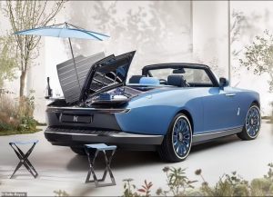 Në pjesën e pasme të makinës përfshihet një set për të shtruar darkë, me tavolinë, frigoriferë për të mbajtur shampanjën, karrige dhe një çadër për t’u ruajtur nga dielli. Kabina është modifikuar m kinën janë dashur 4 vite, ku çdo detaj, nga ngjyra bojëqielli deri te detajet e drunjta, janë punuar me dorë.