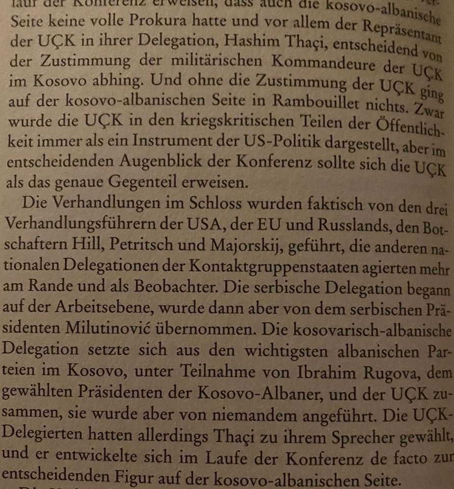 “Hashim Thaçi ishte përfaqësues politik i UÇK-së dhe kryesisht i varur nga përkrahja e komandantëve të të UÇK-së. Dhe pa përkrahjen e UÇK-së, asgjë nuk ecte në Rambuje”, shkruan Fischer në librin e tij.