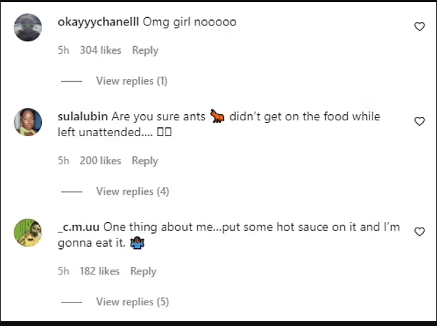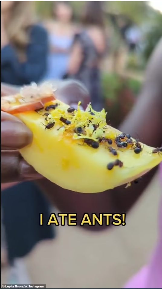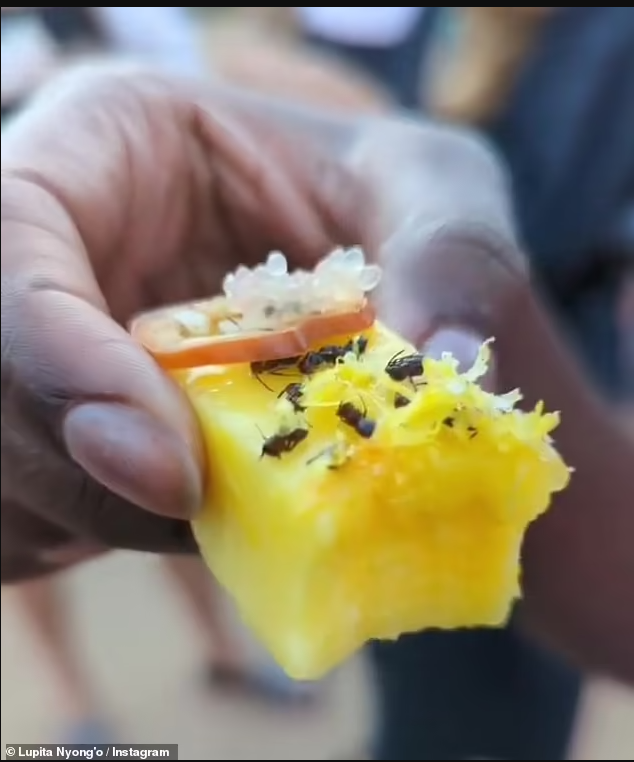 Lupita tregon me krenari delikatesën e këtij ushqimi që duket se është bërë me një frut të fortë me insekte mbi të.