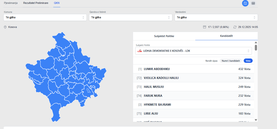 Nga votat e përgjithshme, kur janë procesuar në faqen zyrtare të KQZ-së, 99.65% të tyre, LDK-ja ka marrë 13.57% apo 118 mijë e 772 vota.