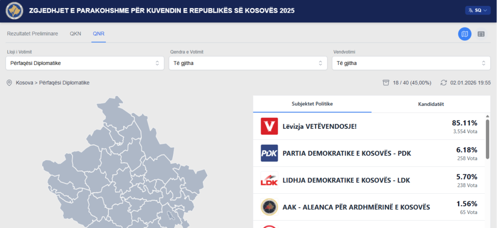 Komisioni Qendror i Zgjedhjeve ka përditësuar të dhënat për numërimin e votave nga përfaqësitë diplomatike, ku deri më tani janë procesuar 18 nga 40 vendvotime, apo 45.00 për qind e tyre.